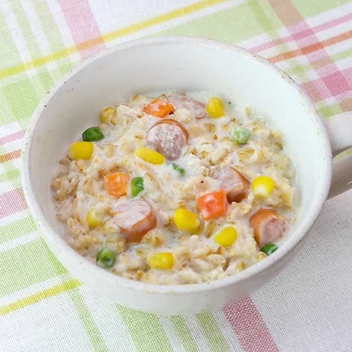 オートミールで作るマグカップリゾットです。材料を入れてレンジで加熱すれば、簡単に1人分ができあがります。ミックスベジタブルを活用し、ソーセージはキッチンバサミで切るので包丁いらずで手軽に作れます。