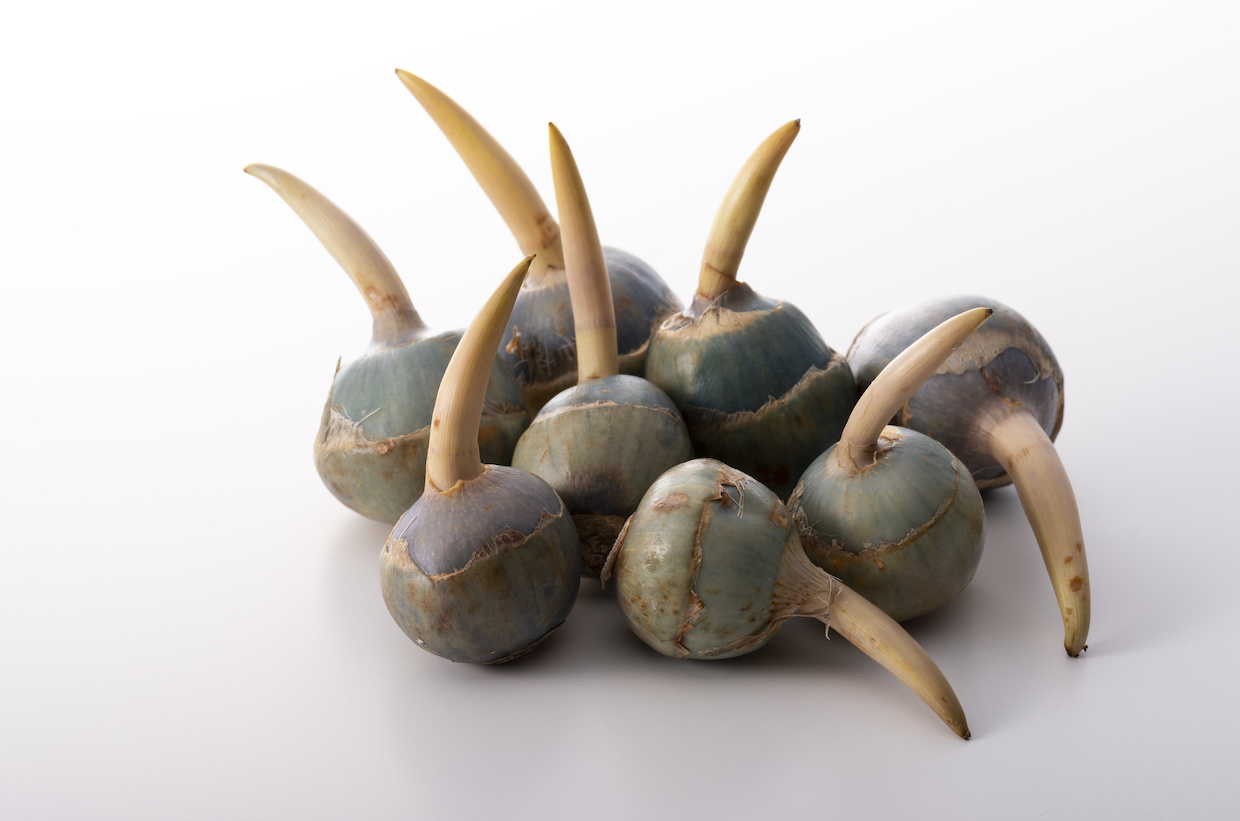 くわいは、中国原産のオモダカ科の野菜で、小さな丸い実に角が生えているような見た目をしているのが特徴です。