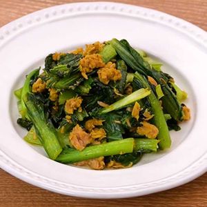 カレー風味の小松菜とツナの炒め物少ない素材でパパッと作れる炒め物。簡単なのに満足感ある一品に仕上がります!ぜひお試しください。