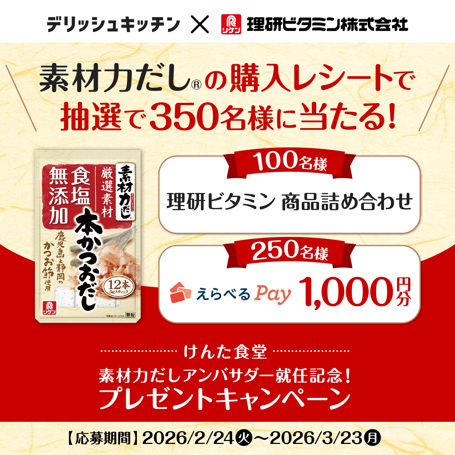 ・理研ビタミン株式会社「素材力だし®」を含む税込200円以上お買い上げのレシートをご提出の上、アンケートへ回答いただいた方の中から抽選で100名様に理研ビタミン商品詰め合わせセット、250名様にえらべるPay(1000円分)をプレゼント