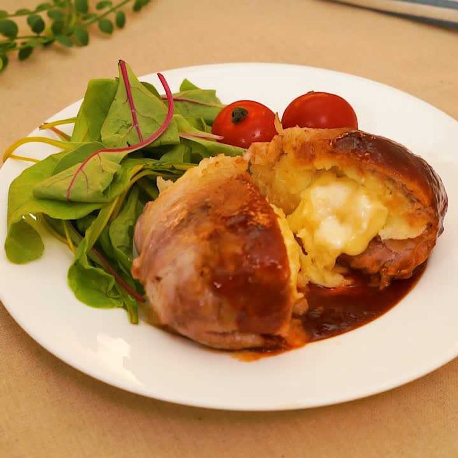 A豚肉、じゃがいもと食べ応えのある食材を使用し、中にチーズを入れ、さらにこってりしたソースをかけています。ボリュームがかなり出る1品なので、満足いただけるかと思います。 1人1個ずつ食べたい場合は、材料を等分に分けて2個お作りください。