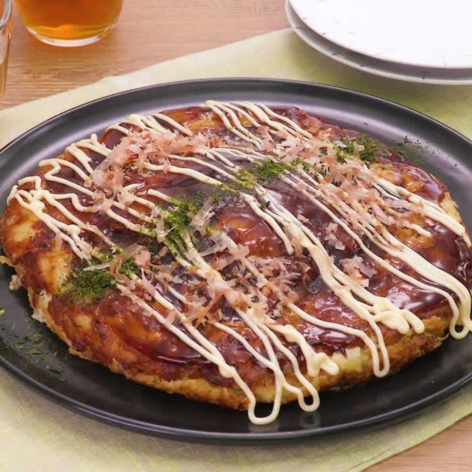 器にお好み焼きを盛り、お好み焼きソース、マヨネーズをかけ、青のり、かつお節をのせる。