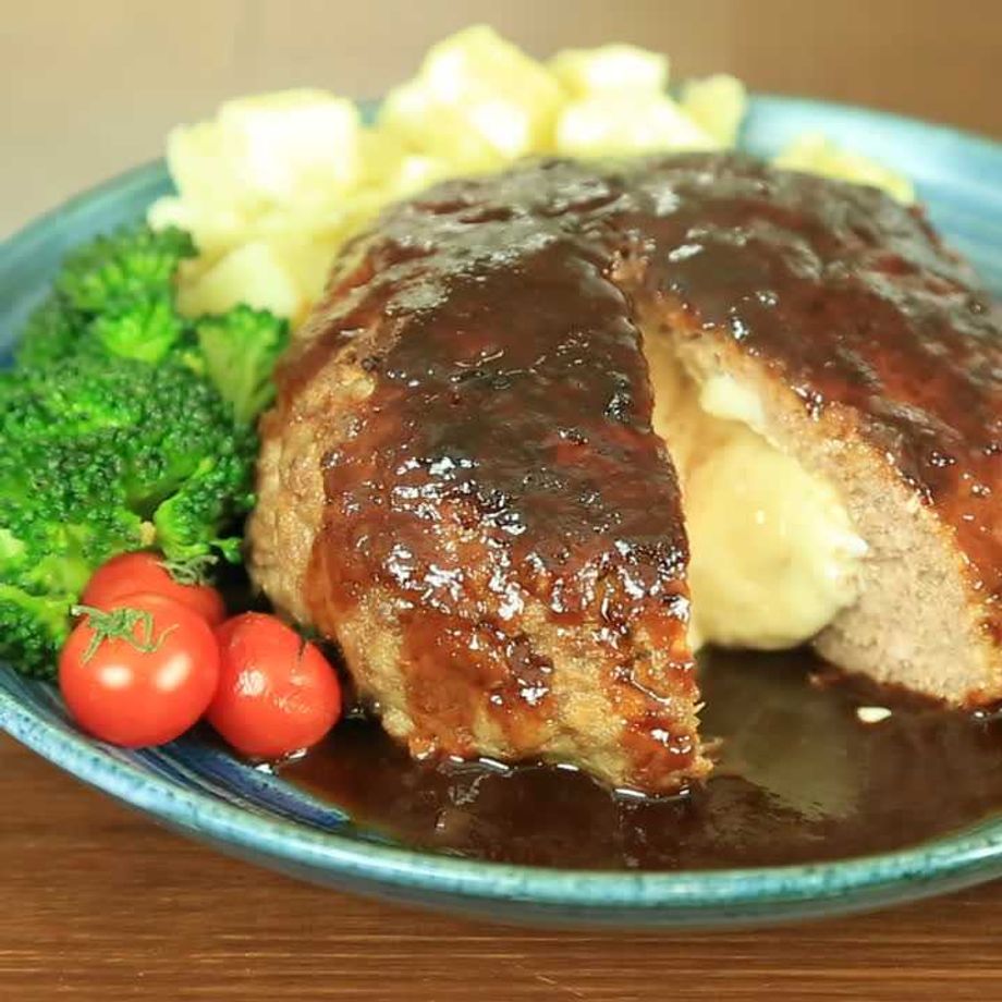 カマンベールチーズを包んだ絶品ハンバーグはいかがですか? 切ったらチーズが溢れ出てきて、食欲が止まりません...! 甘じょっぱいソースを絡めて家族みんなで召し上がれ♪