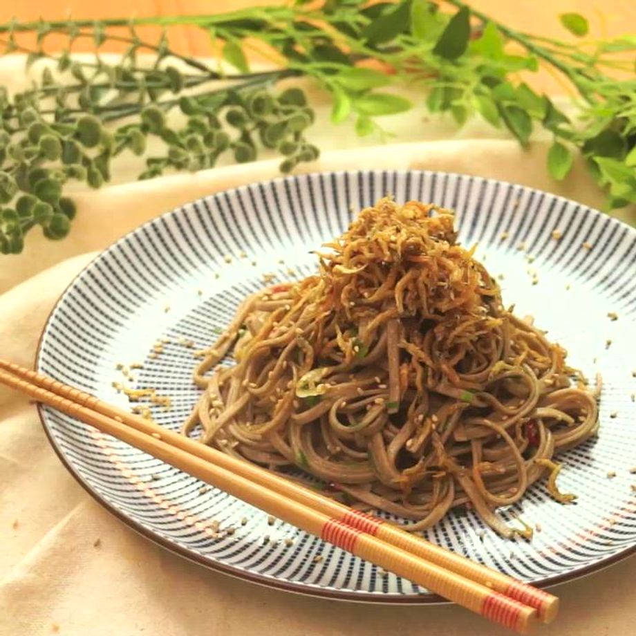 いつもの蕎麦を洋風にアレンジ! 特別な材料なしにできる簡単メニューです。 香ばしいカリカリじゃこがアクセントに♪