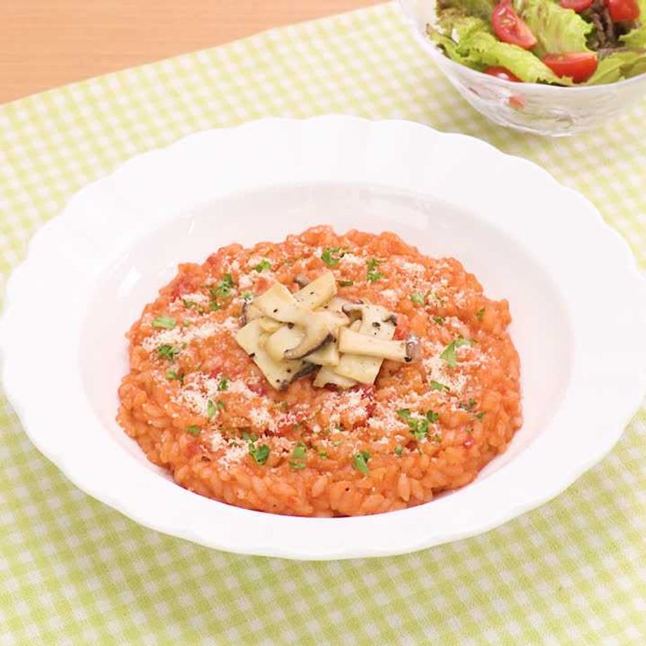 シンプルな味付けで、生米から手軽に作れるトマトリゾットをご紹介します♪トマト缶の旨味と酸味がチーズのコクと相性ぴったりです。きのこの中でもコリコリとした食感が美味しいエリンギをのせてお召し上がりください!※より美味しく作れるように材料と工程を見直しました。2019年9月