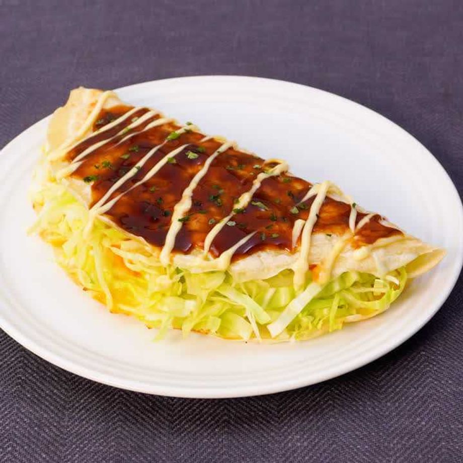 フライパンにサラダ油を入れて熱し、生地の半量を入れて薄くのばす。キャベツの半量を広げ入れ、真ん中に卵(1個)をのせる。ふたをし、弱火で6分ほど蒸し焼きにする。