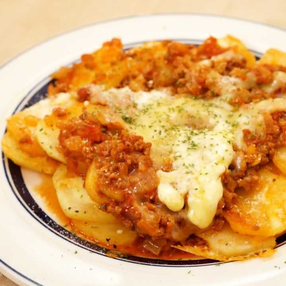 - ミートソースの缶詰とフライドポテトの冷凍食品を使いました。子どもにも好評で、時短できました。 盛り付けの時に、ぐちゃぐちゃにしてしまいました汗 フライドポテトをフライパンで上げ焼きしてそのまま、ミートソースをかけたので、油がすごいことになったので、次回するとしたらレンジとか、他の方法でしたいと思いました。