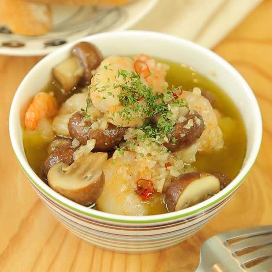 にんにくとバターの風味がオリーブオイルにしっかりと染み込んだアヒージョのご紹介!えびとマッシュルームとの相性も抜群です。オイルはパンをつけて食べるのがおすすめ♪ワインのおつまみにぴったりな一品です。