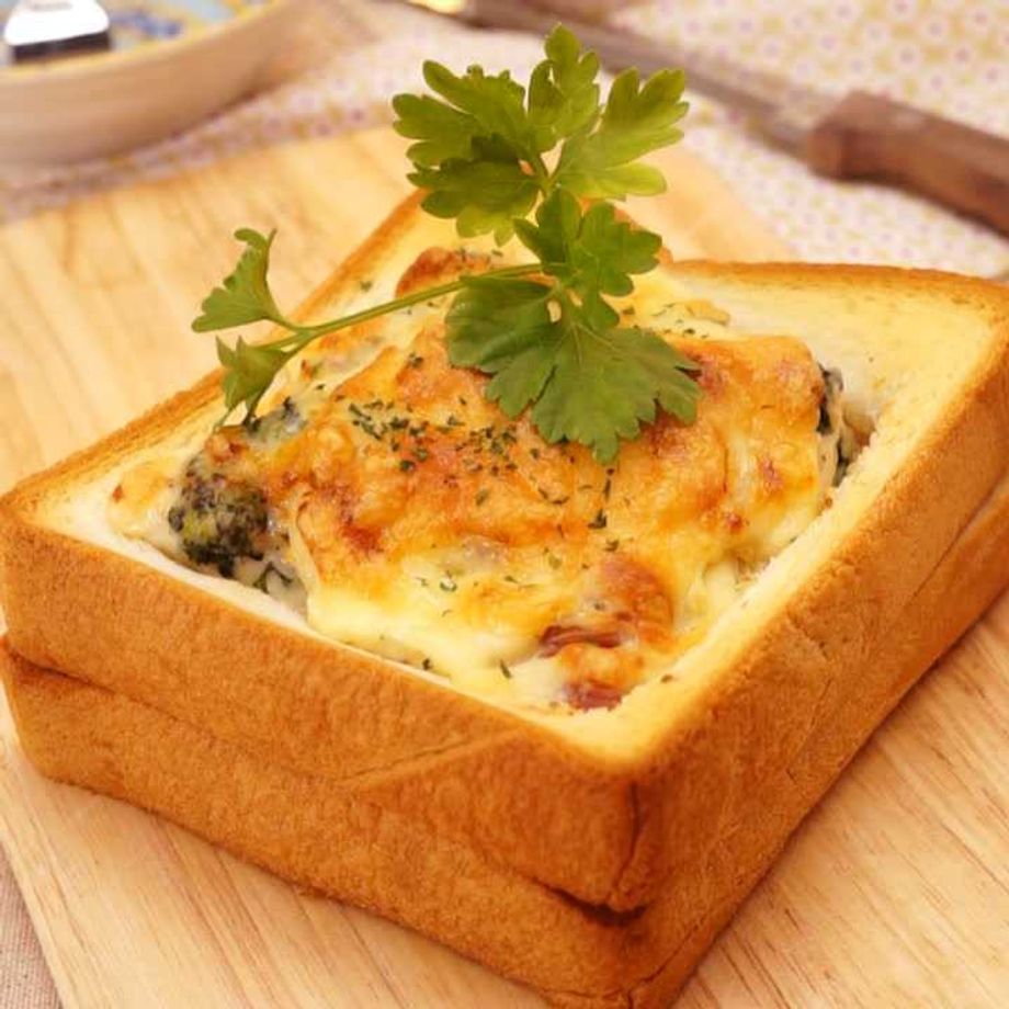 寒い季節にぴったりな厚切り食パンのとろ~りグラタン!食パンのサクサク食感とチーズのとろとろ感の組み合わせが人気です。器がパンだから最後まで楽しめるのもポイント。厚切り食パン2枚で気軽に作れます。付け合わせにお好みでサラダを添えてどうぞ。