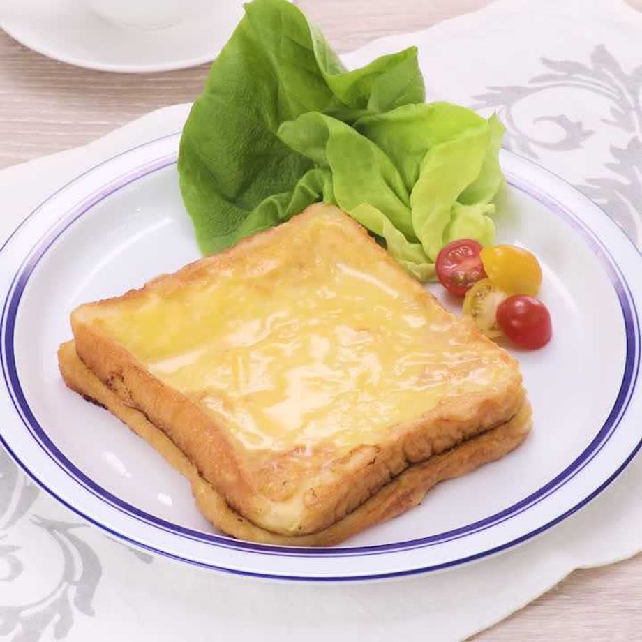 残りのバター(5g)を入れて熱し、残りの食パンを同様にして両面を焼く。とろけるスライスチーズをのせ、もう1枚の食パンをのせ、バットに残ったスープをかけてふたをし、弱火で3分ほど蒸し焼きにする。
