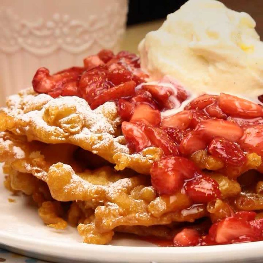 粉砂糖をふりかけて、いちごソースとアイスクリームをトッピングして完成!