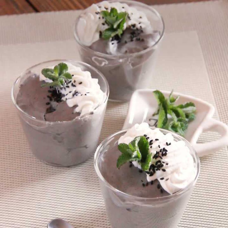 7を器に流し入れ、冷蔵庫で1〜2時間ほど冷やし固める。ホイップクリーム、黒ごま、ミントをのせる。