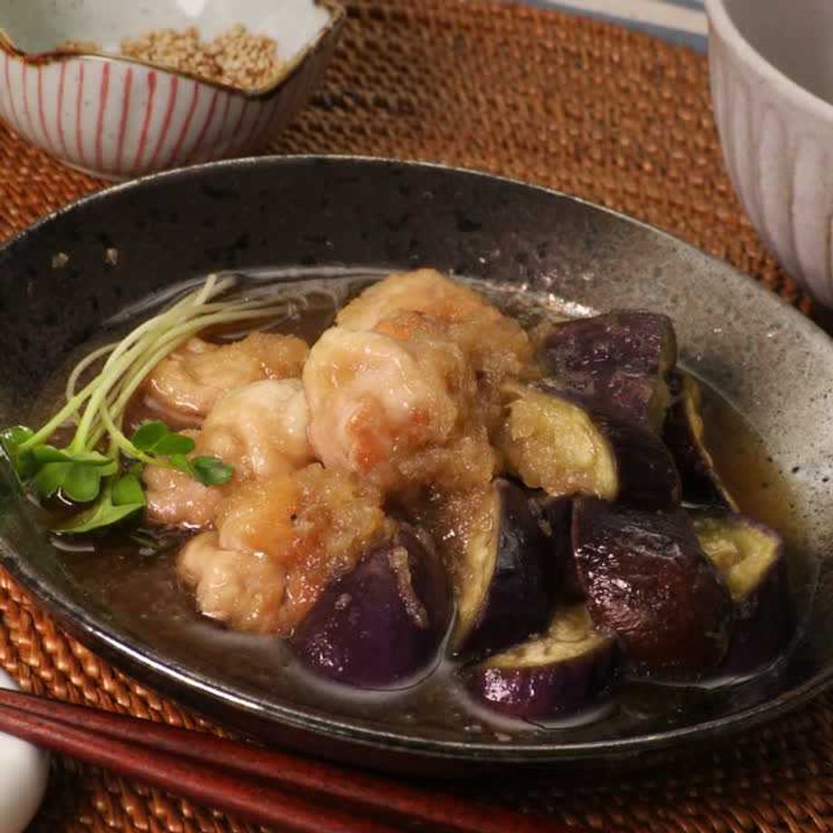 豚バラ団子につゆの旨味が染み込みます! なすも口溶け柔らかな仕上がりです。 大根おろしをたっぷりいれて召し上がれ♪