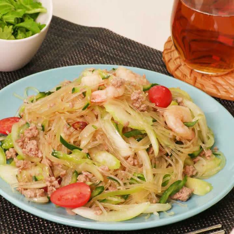 夏にピッタリの甘味、酸味、辛味そして塩味が渾然一体となったタイ風春雨サラダ、ヤムウンセン。名前の「ヤム」とは「和える」という意味、「ウンセン」は「春雨」という意味で、春雨など具沢山であっさりとした味付けが人気です!お好みの材料をオリジナルのタレで和えるだけなので、あっという間に完成!パクチー好きはこんもり盛ってめしあがれ♪