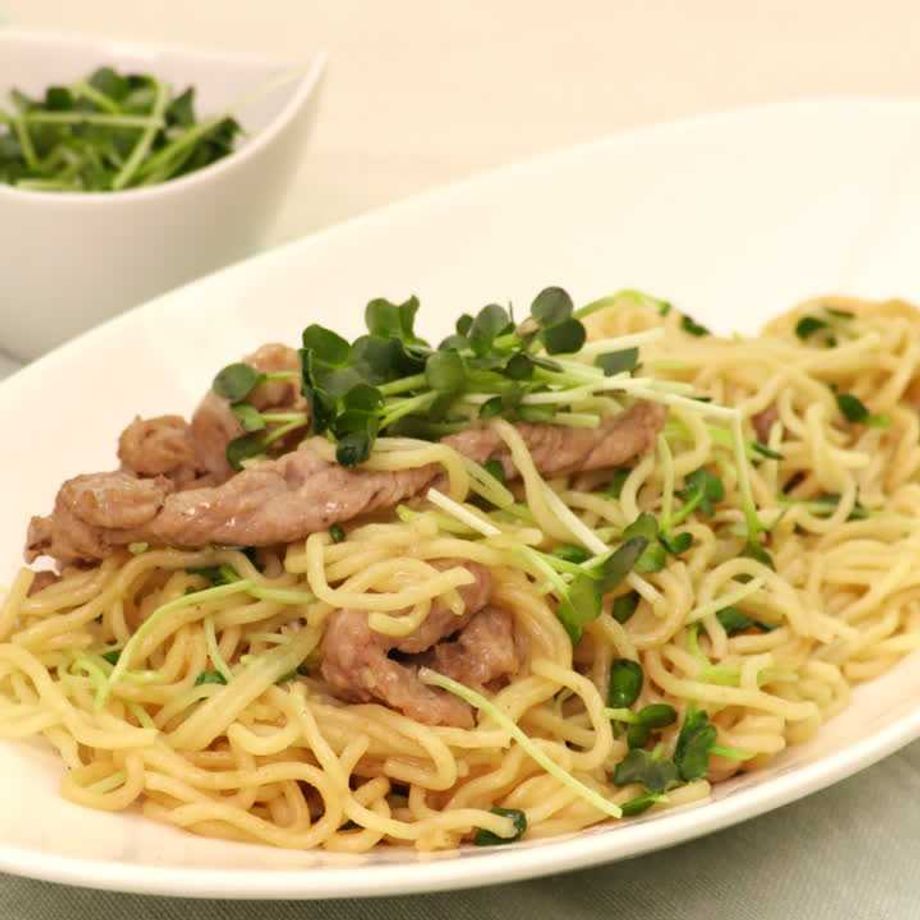 フライパンなしで洗い物が少なくできる和風焼きそば。 ポン酢で味付けをしているので、さっぱりとした味わいです。 カイワレのほろ苦さが絶妙な味わいです♪