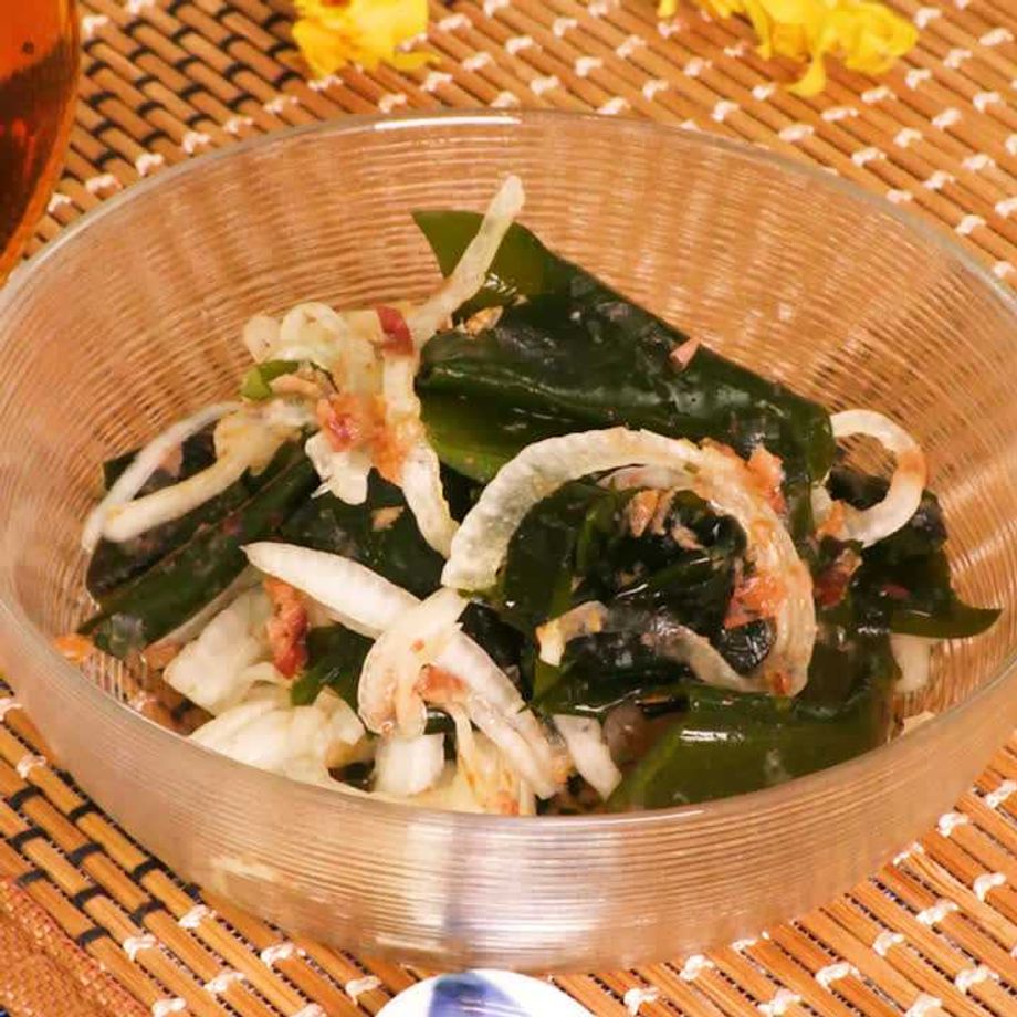 ボウルにわかめ、新玉ねぎ、めんつゆ、水を入れて混ぜ、かつお節を加えて混ぜ合わせる。