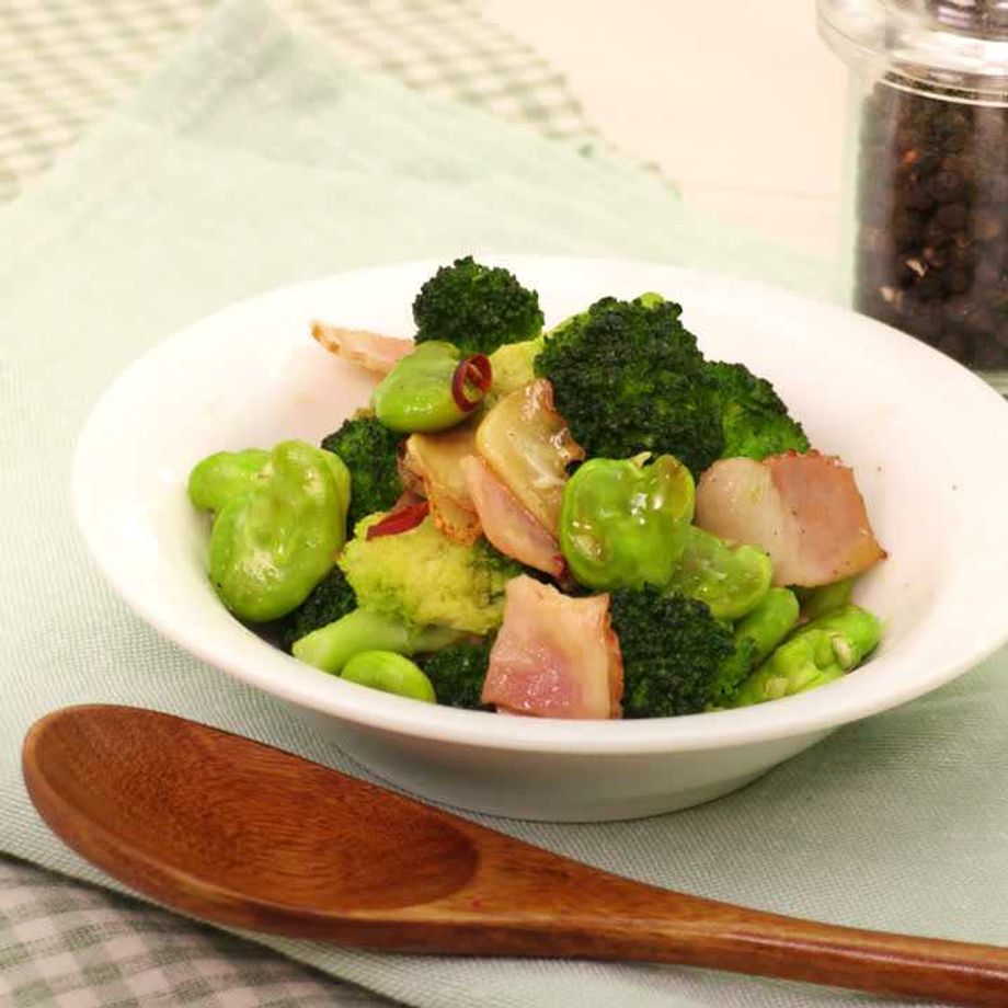 フライパンにオリーブオイル、にんにく、赤唐辛子を入れて弱火で熱し、にんにくの香りが立ってきたら、ベーコン、そら豆、ブロッコリーを加えて焼き色がつくまで中火で炒める。塩こしょうをふってさっと炒める。