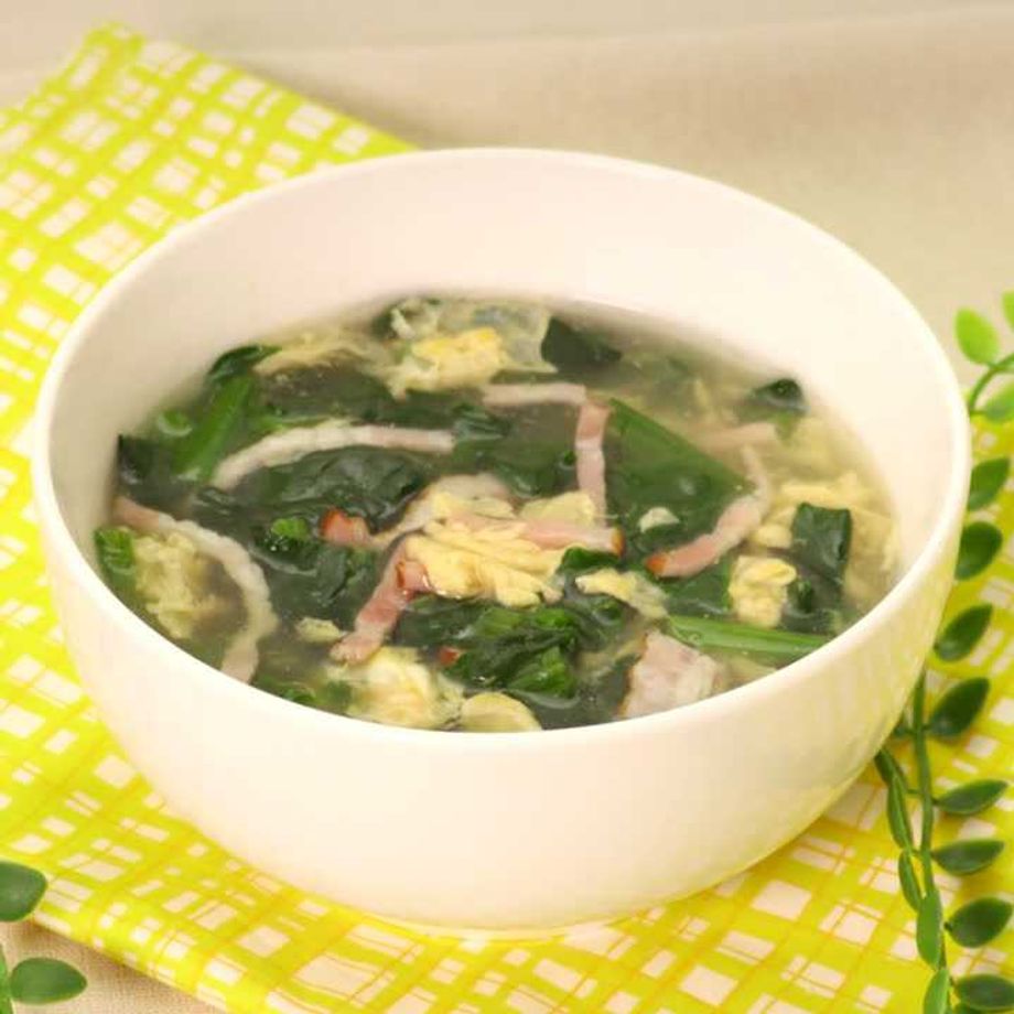 鍋に水、洋風スープの素を入れて火にかけ、煮立ったら塩、こしょう、ベーコン、おろししょうがを入れ、再び煮立ったらフタをして弱火で3分煮る。