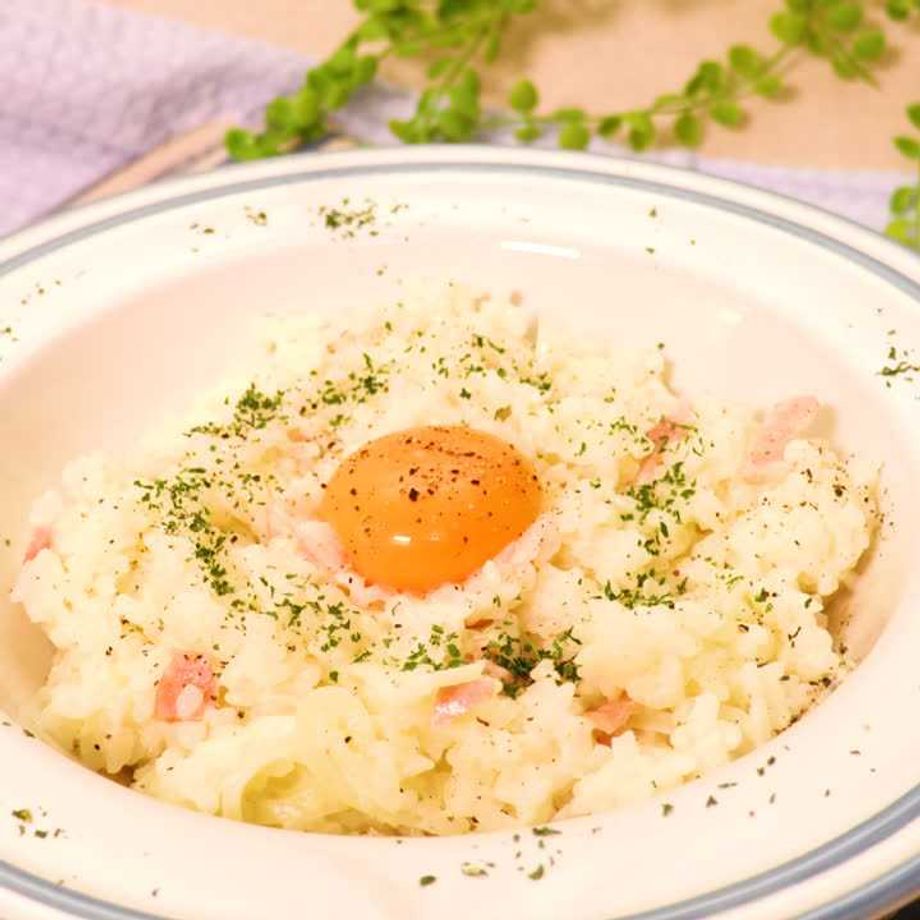 お子様も大好きなカルボナーラごはんのレシピです! とろ〜り卵と濃厚なチーズが絡んで絶品! 生クリームを使わないのでお手軽にできますよ♪