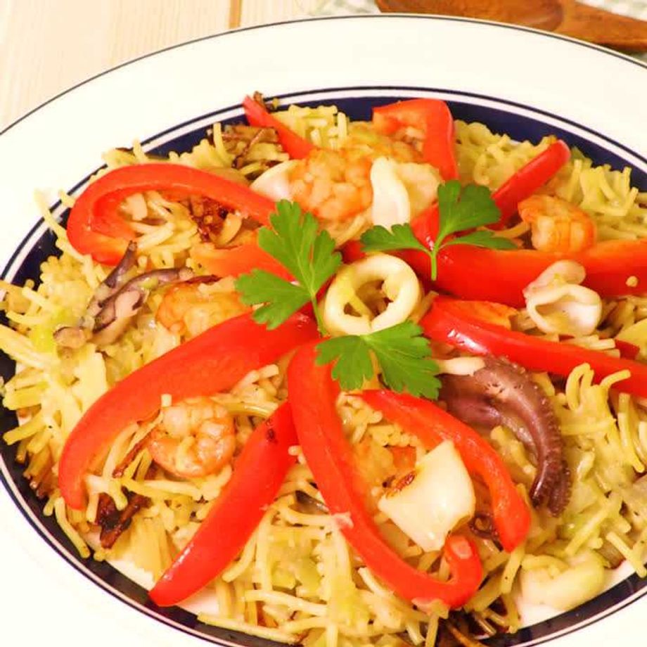 パスタをパエリア風に簡単アレンジしませんか? パリパリしたパスタの新食感が楽しめます♪ シーフードミックスを使って本格的な風味が味わえる1品!