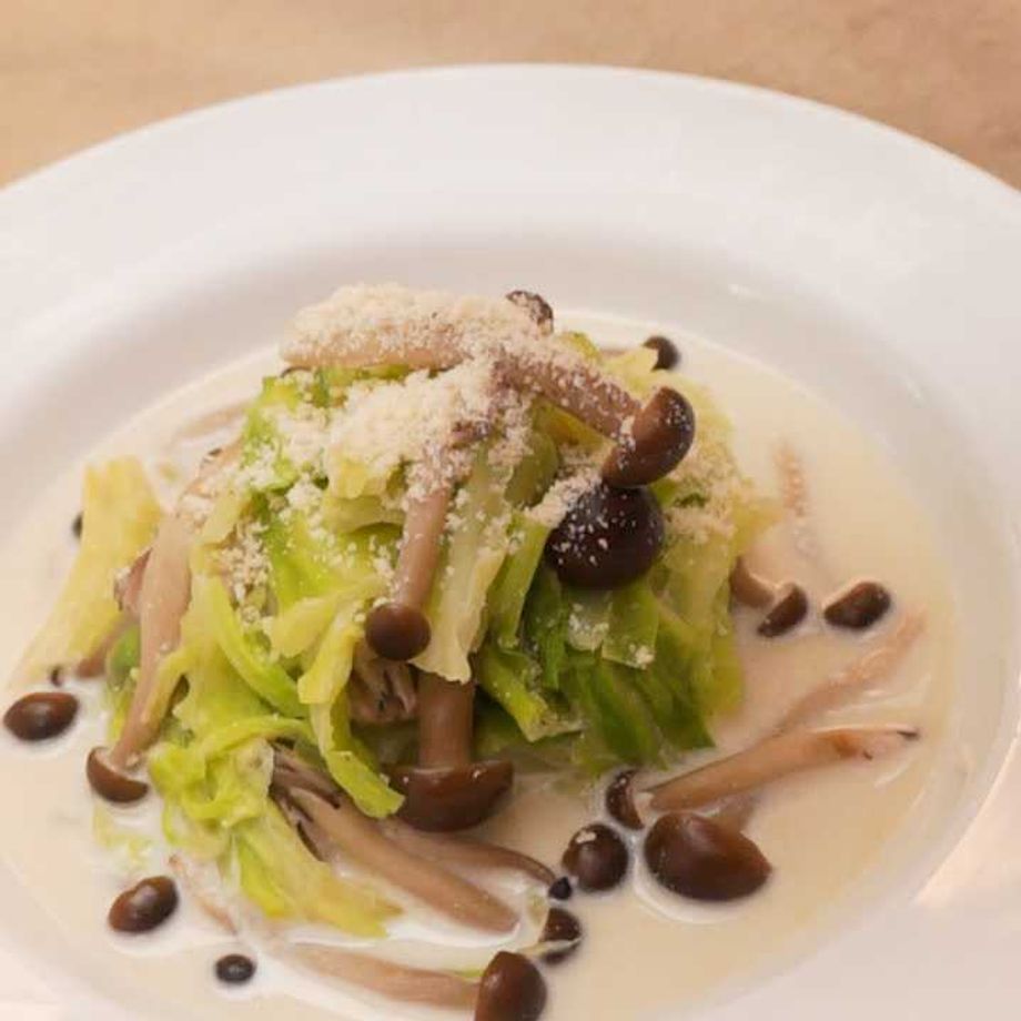 耐熱容器に牛乳、コンソメ、塩、水、こしょうを入れて混ぜ、しめじ、キャベツを入れる。 ふんわりとラップをかけて、600wで7分加熱する