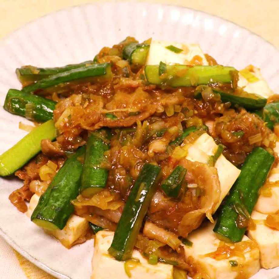 豆板醤の代わりに甜麺醤と一味を使いました。 きゅうりの炒め物は初めてでしたが、とっても美味しいです!😋 ピリ辛味が豚肉にしっかりついて、豆腐との相性も抜群です✨