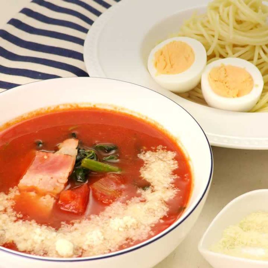 ナポリタンをつけ麺風に味わうレシピのご紹介です。トマトの酸味が効いたつけ汁で、箸が止まりません♪粉チーズをたっぷりかけて、ゆで卵をそえてお召し上がりください。