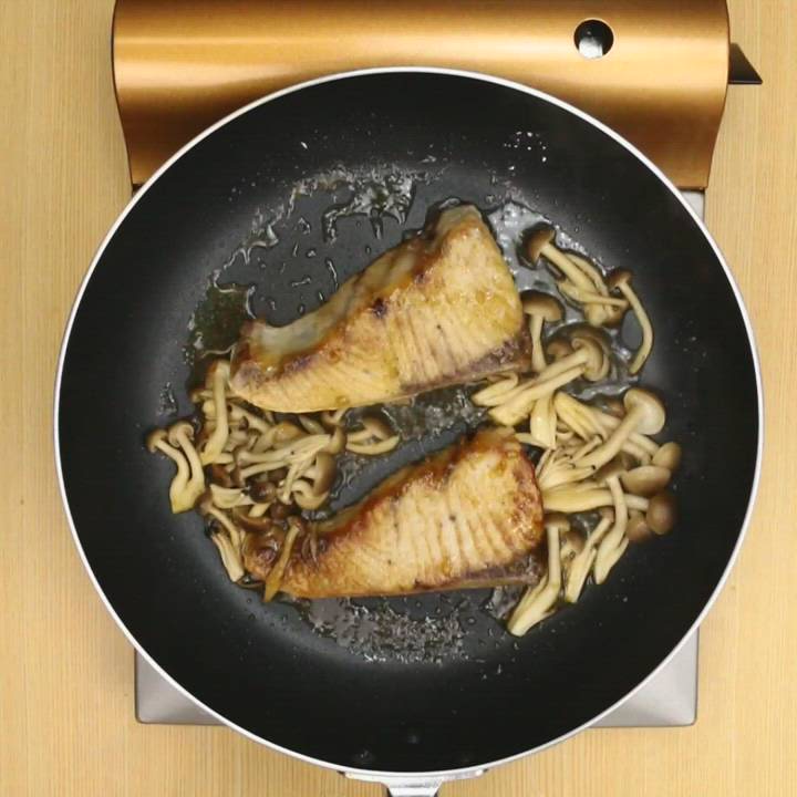フライパンにサラダ油を入れて熱し、ブリを入れて中火で焼く。焼き色がついたら裏返して、空いている所にしめじを食べやすい大きさにほぐして加える。