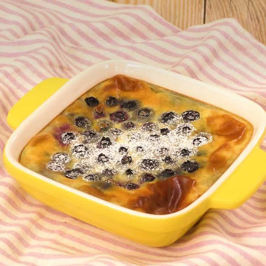 耐熱容器にバターを塗り、1/4量のブルーベリーを入れる。2.を流し入れて残りのブルーベリーをちらす。180度に予熱したオーブンで20~30分焼く。粗熱をとり、3時間以上冷蔵庫で冷やす。