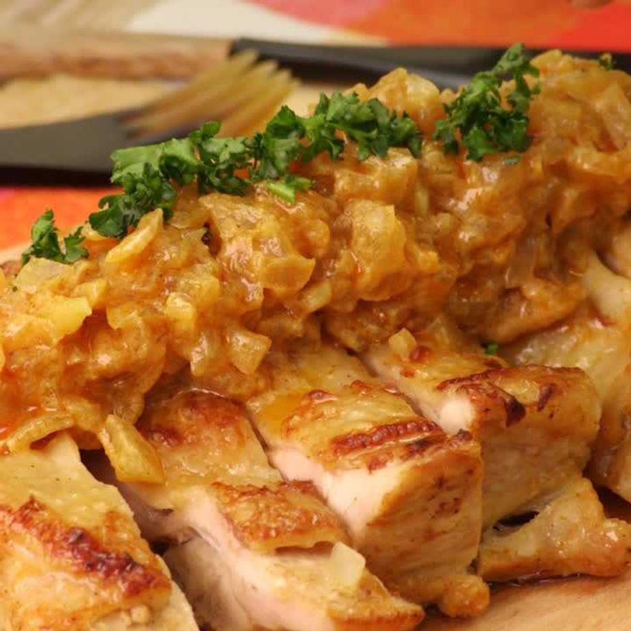 タンドリーチキンの玉ねぎソースというところです。塩味が薄いとあったので、鶏肉470㌘に対して小さじ3分の1入れました。ウチは薄味ですがそれでも薄かったので次は小さじ半分入れます。 ソースが無駄にならずに食べてしまうのでよいです☺️✨