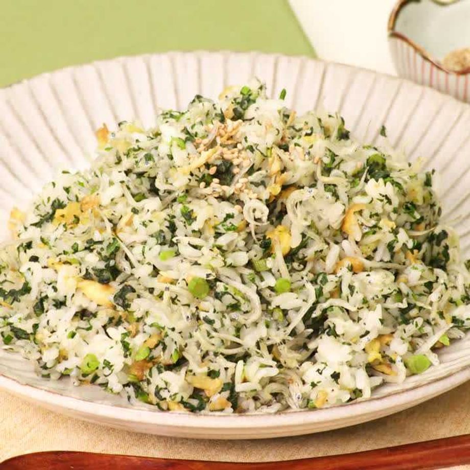 春菊のほろ苦さとちりめんじゃこの香ばしさが食欲をそそる! 春菊を刻んでごはんと炒めて簡単調理! 一味違う和風チャーハンはいかがでしょうか?