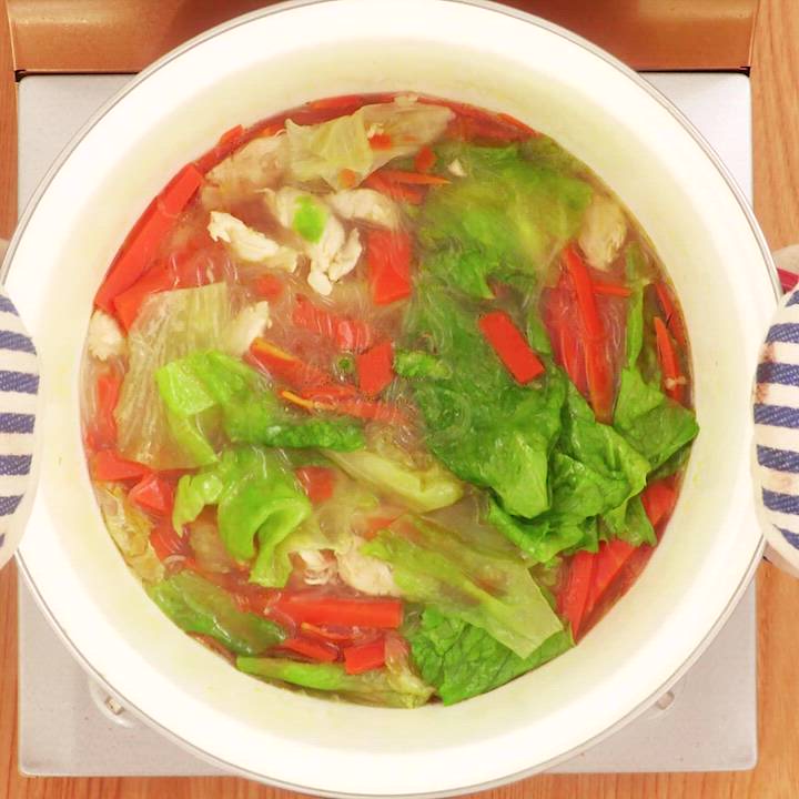 レタスのかわりに余っていた水菜、ささみのかわりにサラダチキンにしたので、簡単にできました。ボリュームのあるスープになり、満足です!ぴんくふぇありー