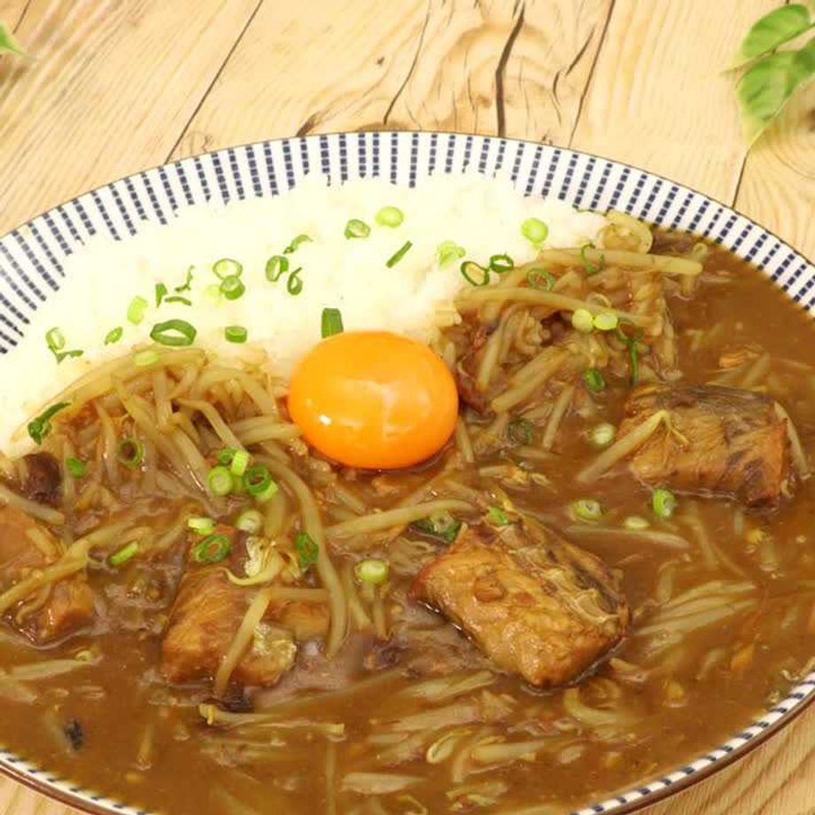 いつもと一味違うカレーはいかがでしょうか♪ めんつゆとサバの味噌味が効いて奥深い味に。 盛りだくさんのもやしで食べ応えバッチリ!