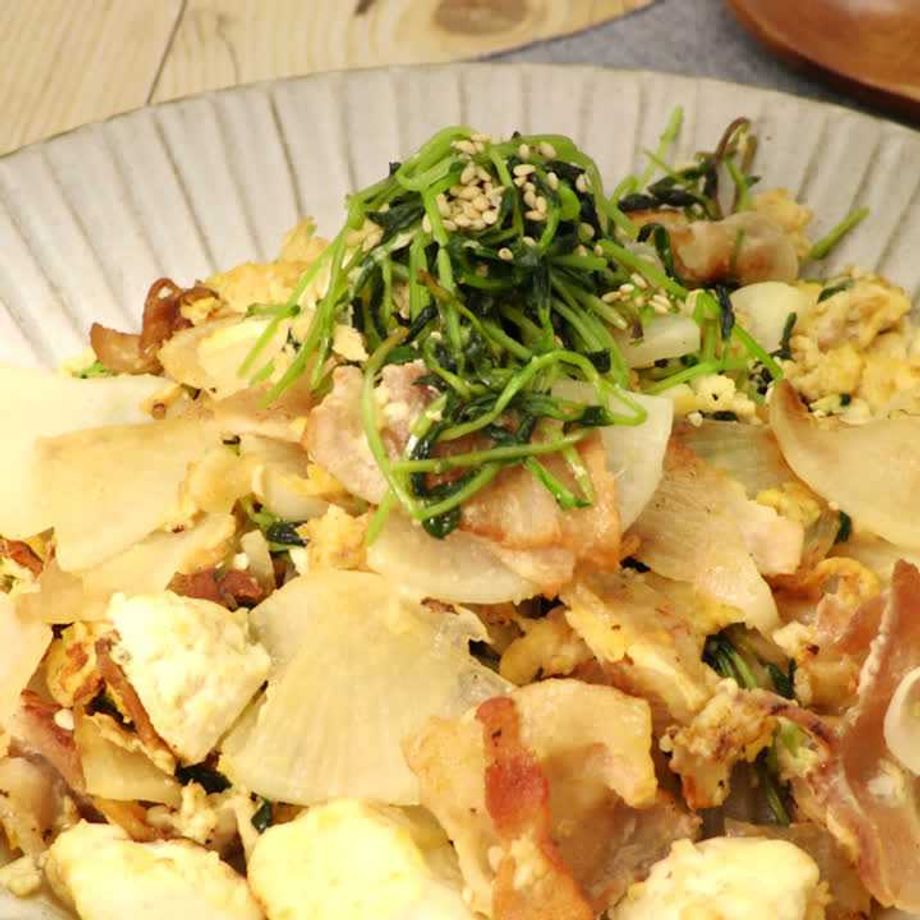 フライパンにごま油、豚肉を入れ中火で肉の色が変わったら豆腐を入れ焼き色をつける。大根、豆苗を加える
