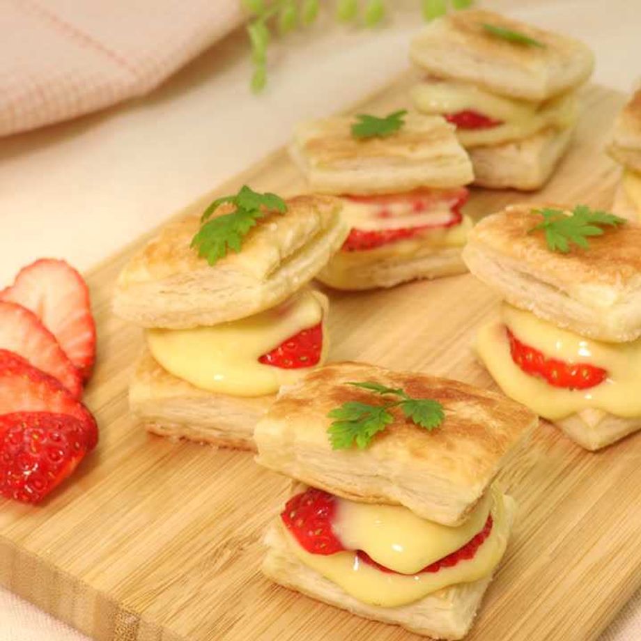 冷ましたパイ生地にカスタードクリーム、いちご、カスタードクリームの順に重ね、パイ生地をのせる