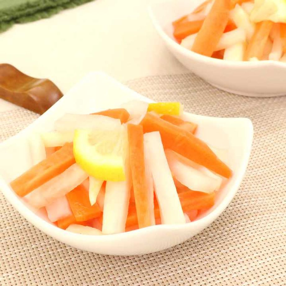 ボウルにレモンの絞り汁、はちみつを入れて混ぜ、レモン、にんじん、大根を加えて混ぜる。冷蔵庫で30分以上おいて味をなじませる。