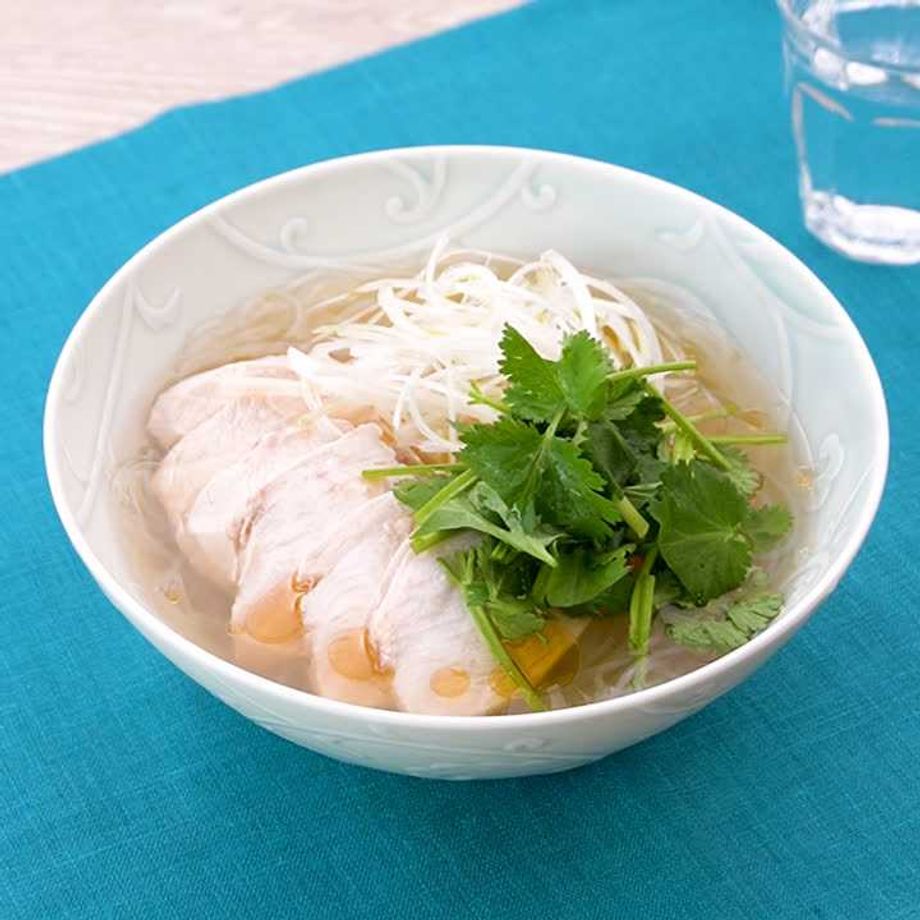 フォーの代わりに、簡単に手に入る春雨を活用した一品です。鶏胸肉と一緒に食べることで、春雨でも食べ応えばっちり!スープにはしょうがやレモン汁が入っているので、あっさりとした味わいです。※より作りやすくするため調味料の配合の見直しをしました。2021年4月