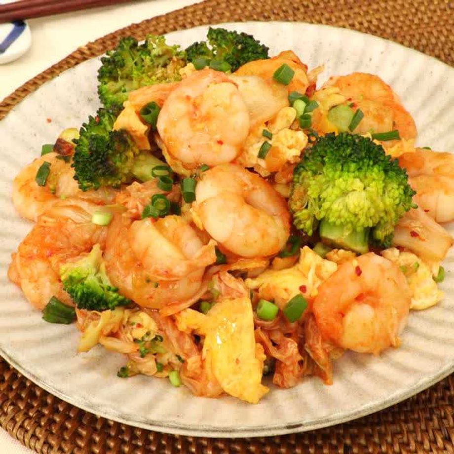 キムチと卵でまろやかな辛さ♪ さらにエビのプリプリの食感がクセになる! がっつり食べれるおかずとしても良し、お酒のつまみにも良し!