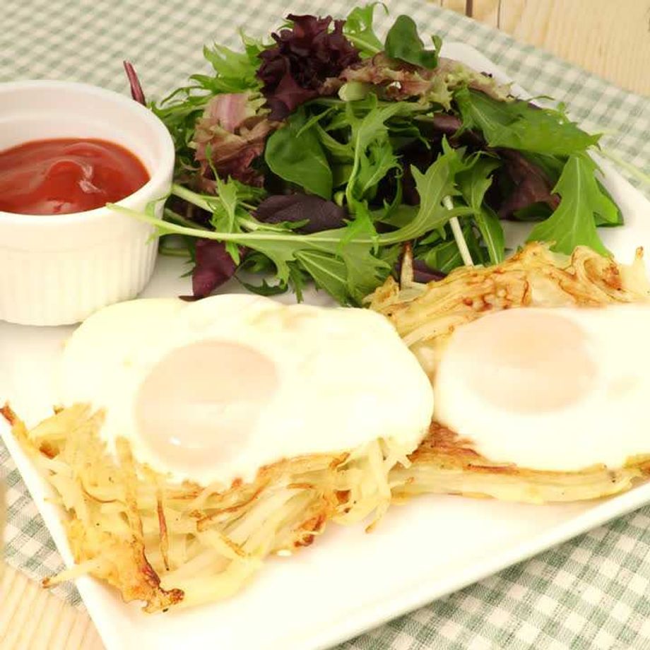 じゃがいもを使って自宅で簡単にできるガレット! ホクホクポテトとカリッとチーズにとろ~り卵が美味しい一品。 おしゃれに盛れば気分はカフェランチ♪