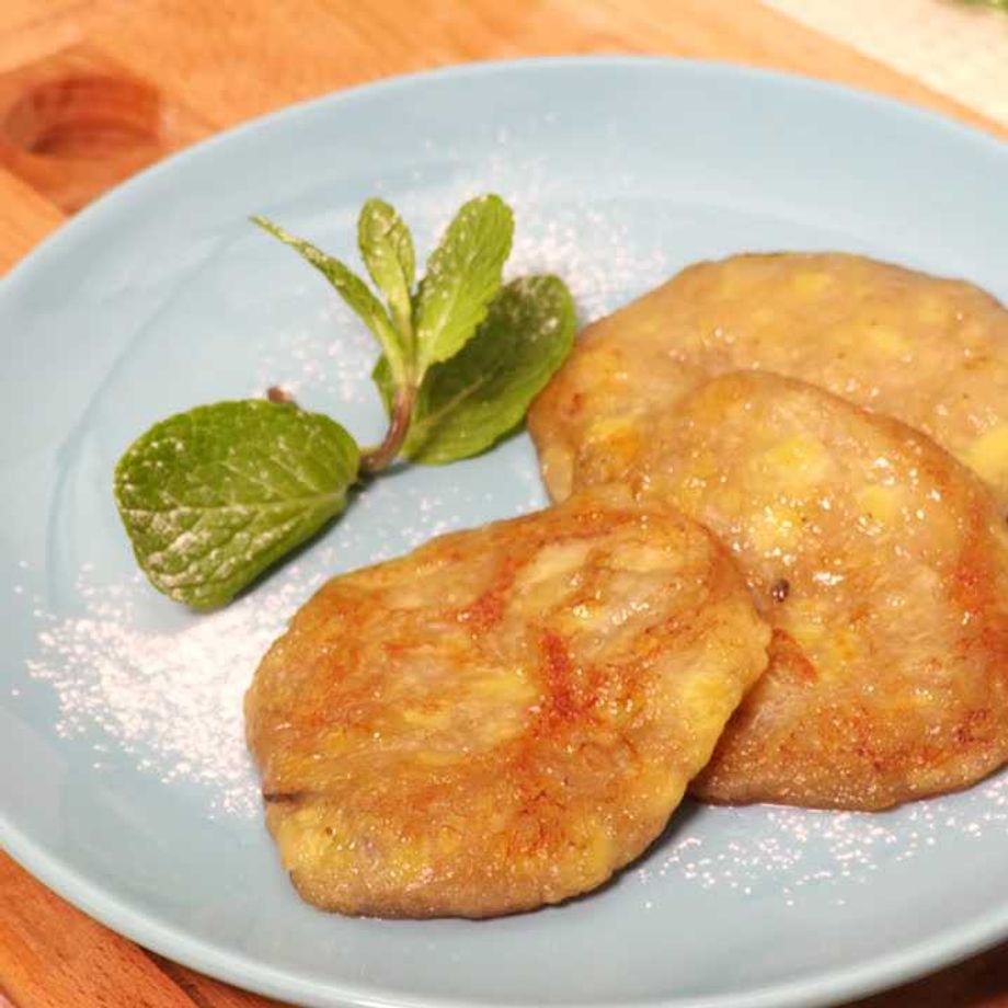 - 甘さが少ない島バナナで作ってみました。 片栗粉10g、パルスイート8g(砂糖なら3倍の甘さになります)、はちみつ3回かける増量をしています。 メープルシロップが無いので、そのままの甘さで食べることを前提に増やしています。片栗粉は水分を増やしたのでその分増やしています。 子供は島バナナは食べないですが、モチモチ甘くて美味しいと好評でおかわりしました!ホットケーキミックス、牛乳が無い中でこのスイーツは神です! フライパンにくっつくとレビューありましたが、サーモスのフライパンはオススメです。油無くても大丈夫です。もう一つ、中が生っぽいというのは、ホットケーキを作っている時によくある事で、その場合必ず弱火にしてからフタをして、2分くらいタイマーではかると良い感じにフワフワにできますよ。