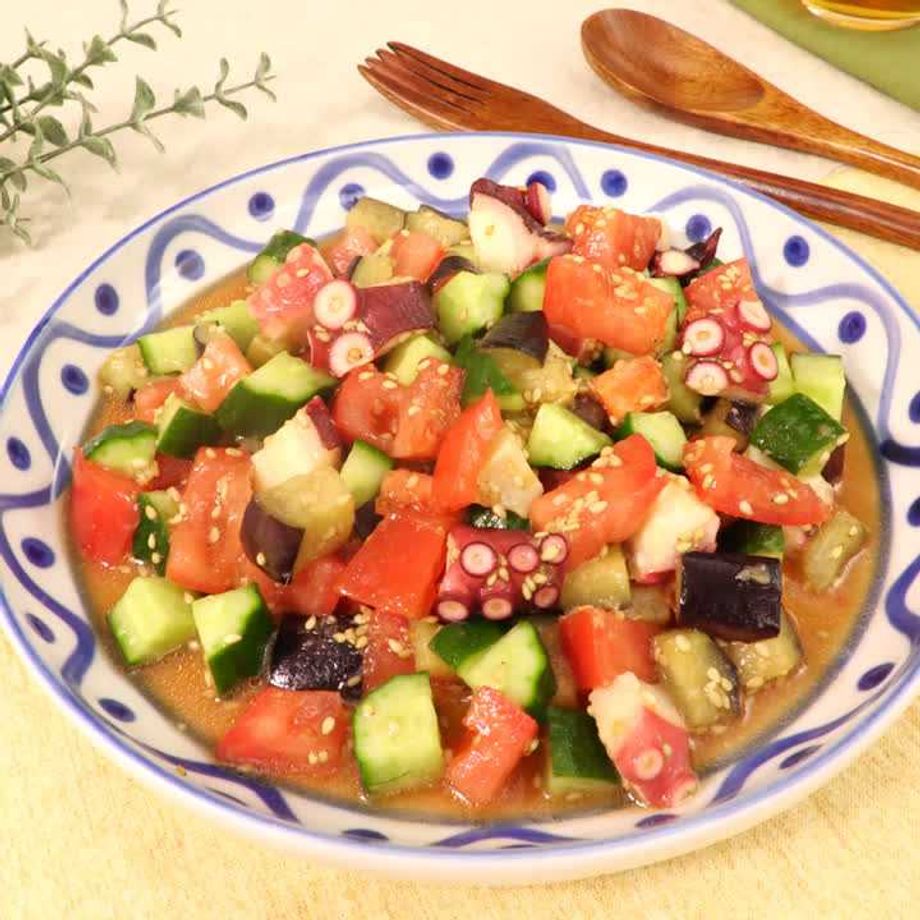 ゆでだこ、なす、きゅうり、トマトは2cm程度の角切りにする。ボウルに☆を入れて混ぜ合わせる。