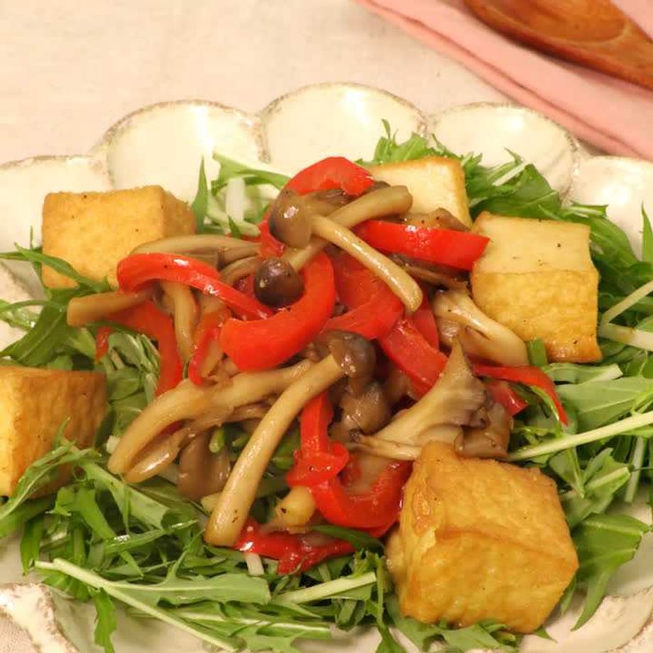 魚が主菜の日、もう少しガッツリしたおかずを足したくて作りました。 水菜は無かったのですが、きのこ多めで。 厚揚げは、サッと炒めるのではなく薄っすら焦げ目をつけて存在感をアップ。 次回は水菜も敷いてみます。メモ