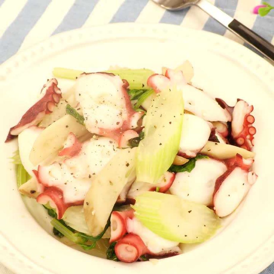 ゆでたこはそぎ切りにする。セロリは筋をとり、茎は斜め切り、葉はざく切りにする。にんにくはみじん切りにする。エリンギは食べやすい大きさに切る。