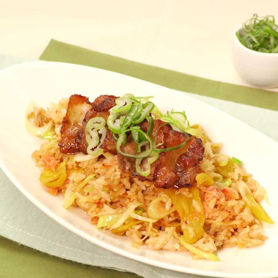 フライパンに白ごはんを入れてほぐしながら炒め、ねぎ、キムチ、たくあん、しょうゆ、いりごま、塩こしょうを加えて炒め合わせる。ねぎがしんなりしたら器に盛り、豚肉とねぎの青い部分をのせて完成!