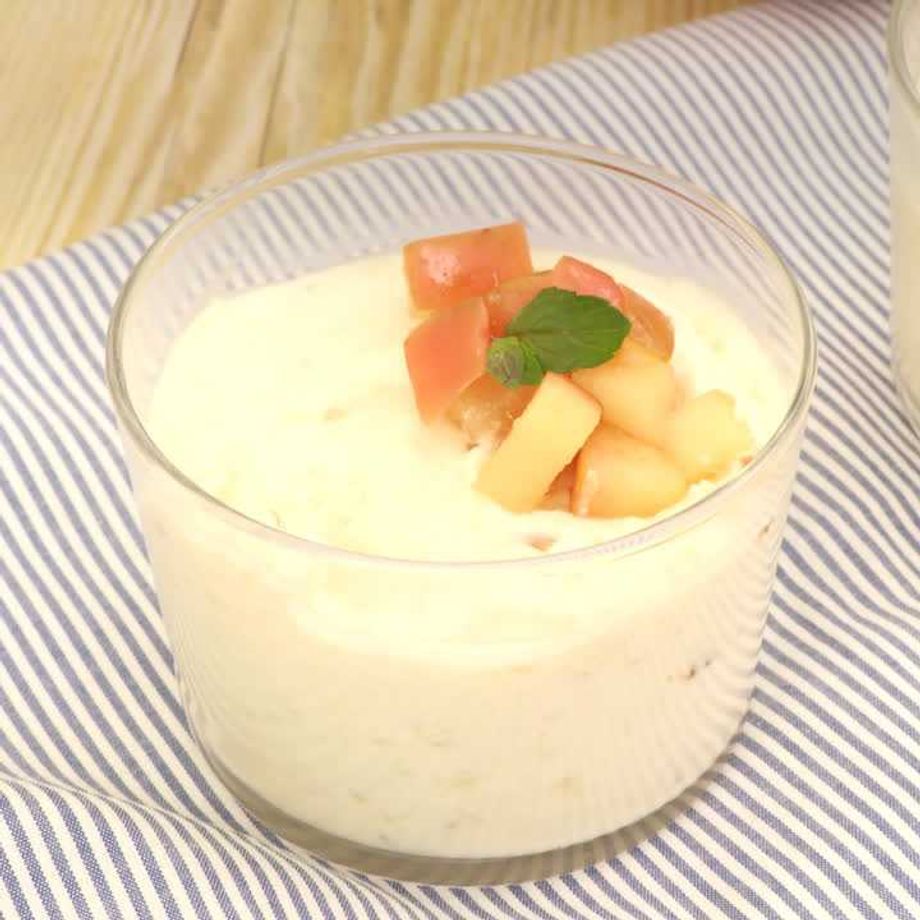 2に生クリームの1/3量を加えて泡立て器でよく混ぜ、残りの生クリームをゴムベラで軽く合わせて器に流し、冷蔵庫で冷やし固めて上にりんごを飾ったら完成