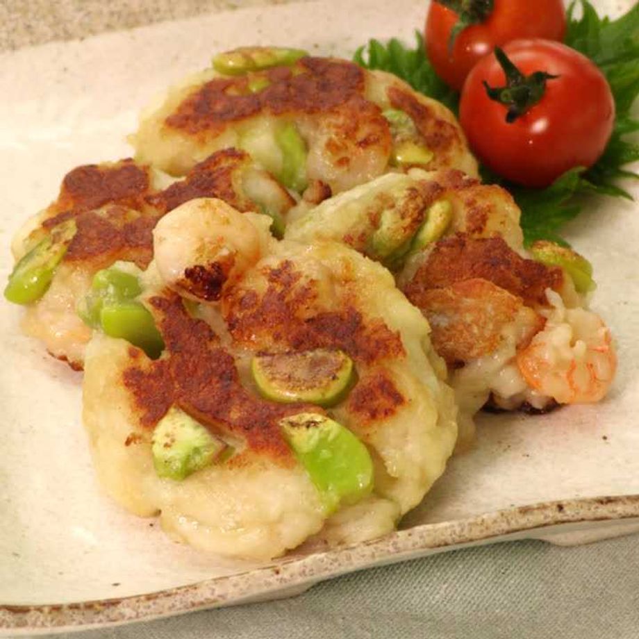 ボウルにはんぺんをちぎり入れ手でつぶし、そらまめ、えび、しょうゆを加え混ぜる
