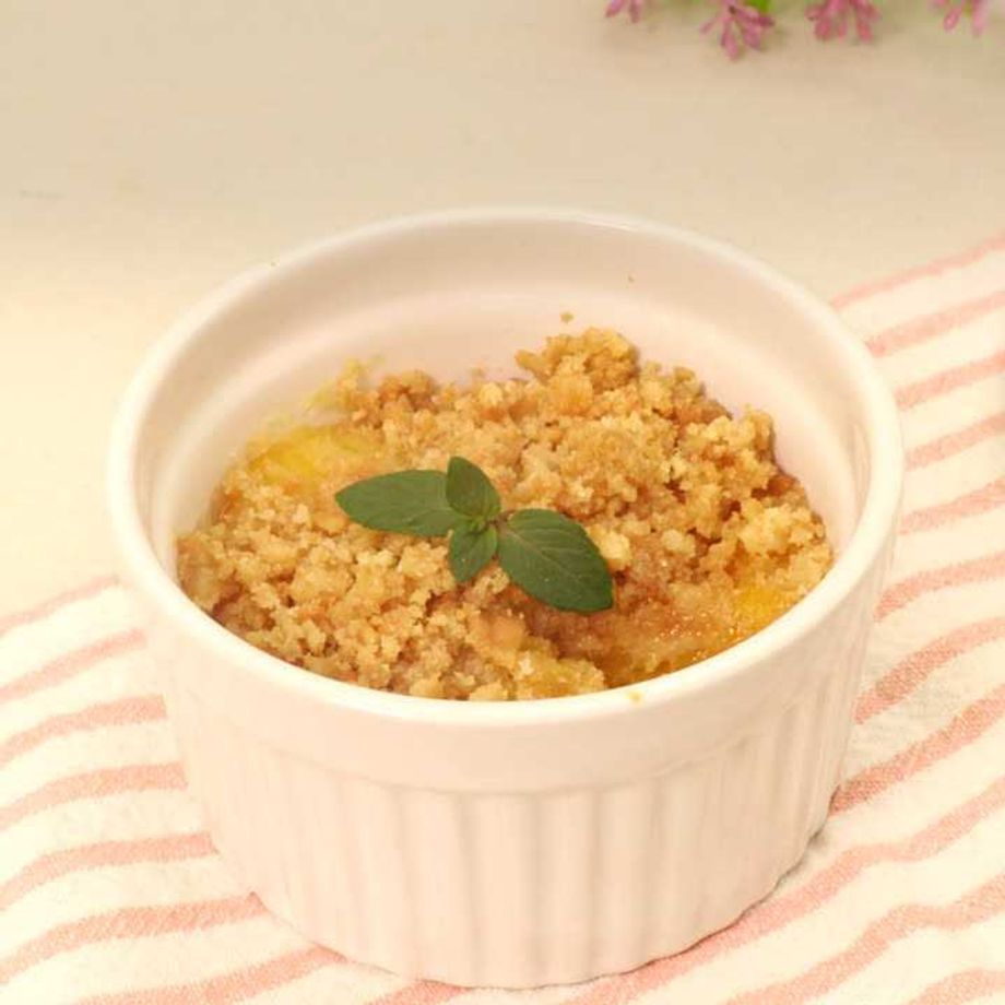 耐熱容器に、煮た黄桃を入れ、クランブルのせて190℃に予熱したオーブンで10分焼いて完成!