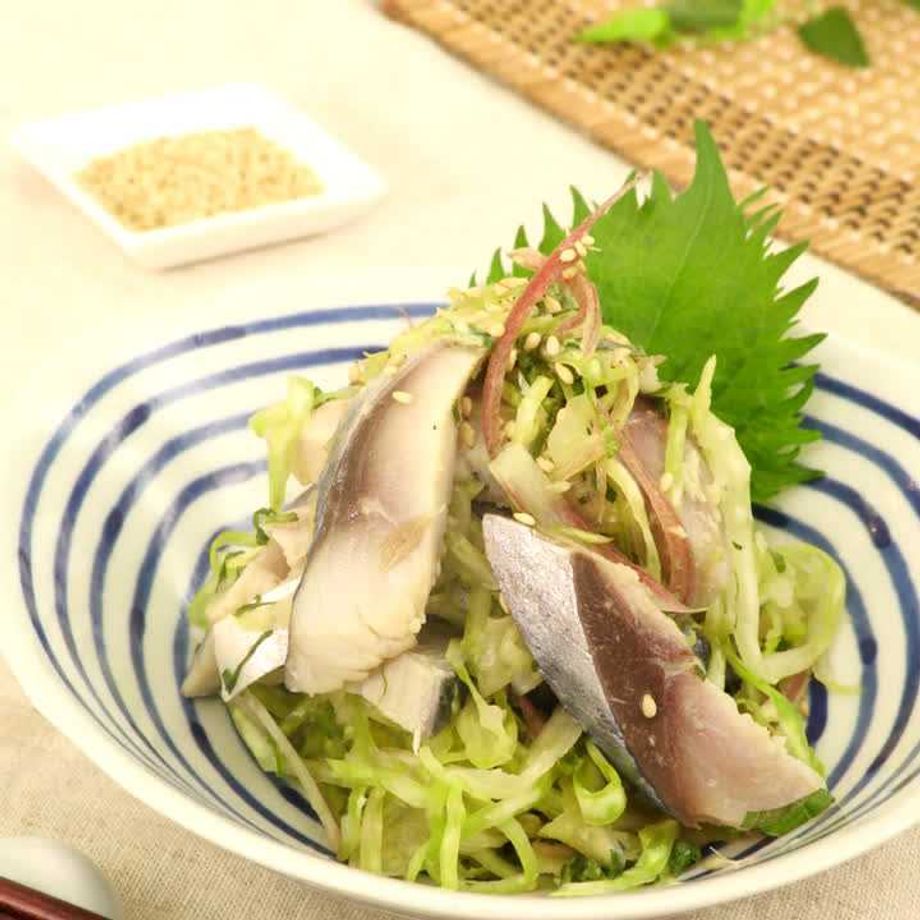 しめ鯖を使っておつまみにぴったりな一品を作りましょう♪キャベツは塩もみしてかさが減るので、思った以上にたくさん食べられます。大葉やみょうが、しょうがなどの爽やかな薬味をたっぷりと加えてどうぞ!
