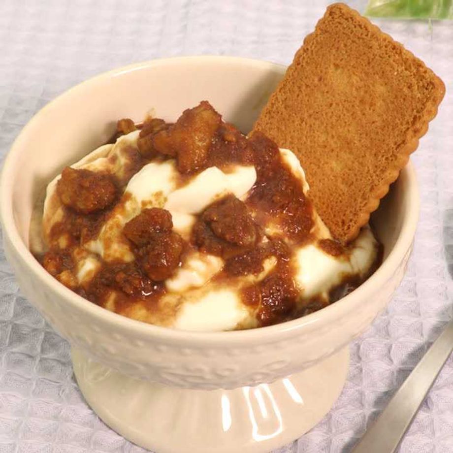 ボウルにインスタントコーヒーと湯を入れて混ぜて溶かし、メープルシロップを入れて混ぜ、砕いたくるみとビスケットを加えて混ぜ、ソースを作る。