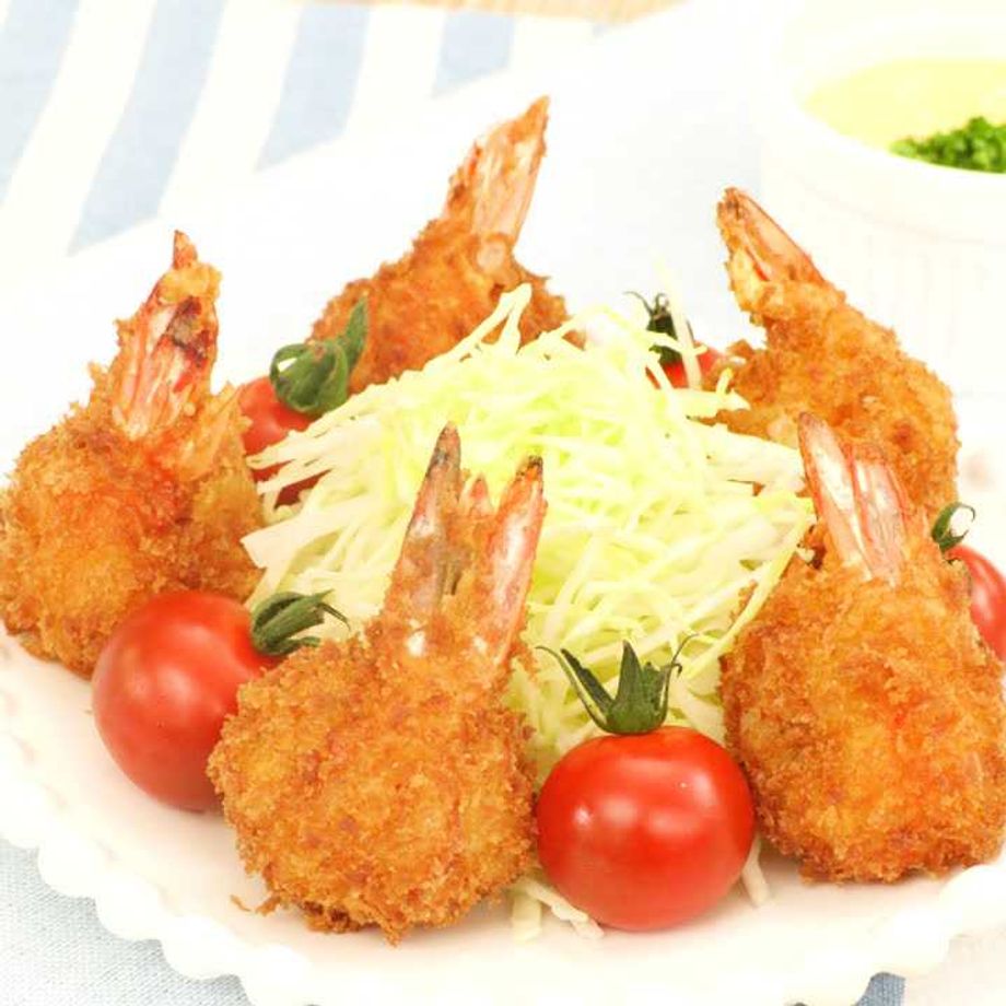 えびに卵液をつけ、パン粉をまぶし、180℃に熱した油できつね色になるまで揚げる